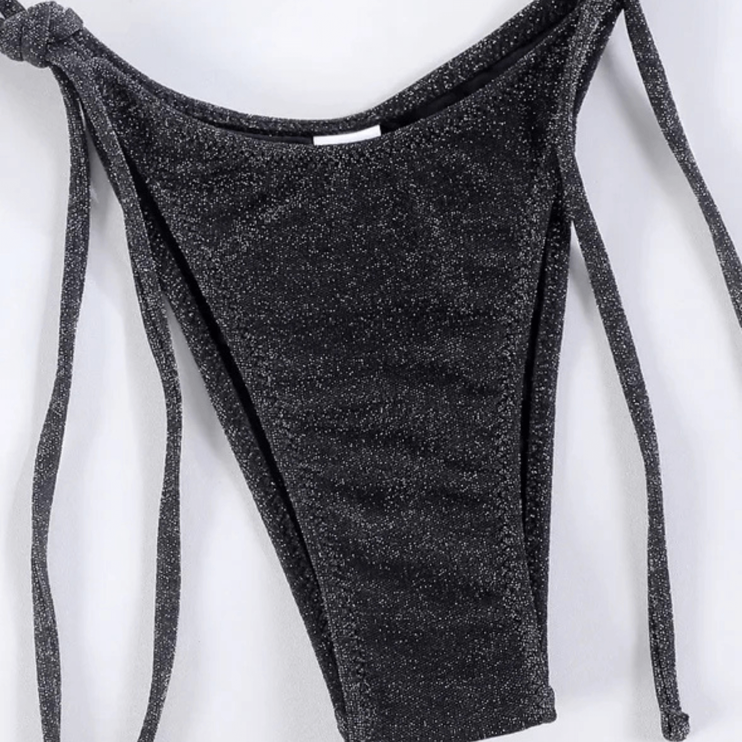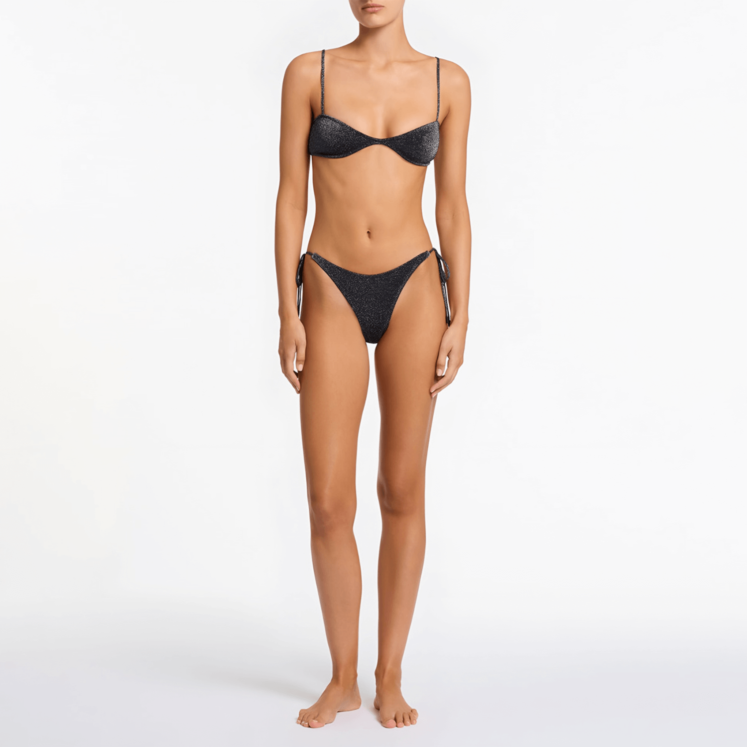Top com bojo triangular minimalista, alças finas ajustáveis e fecho nas costas. Calcinha de lacinho ajustável nas laterais com corte cavado. Acabamento em brilho metalizado e costura reforçada para maior durabilidade.